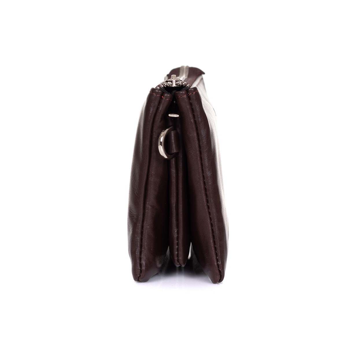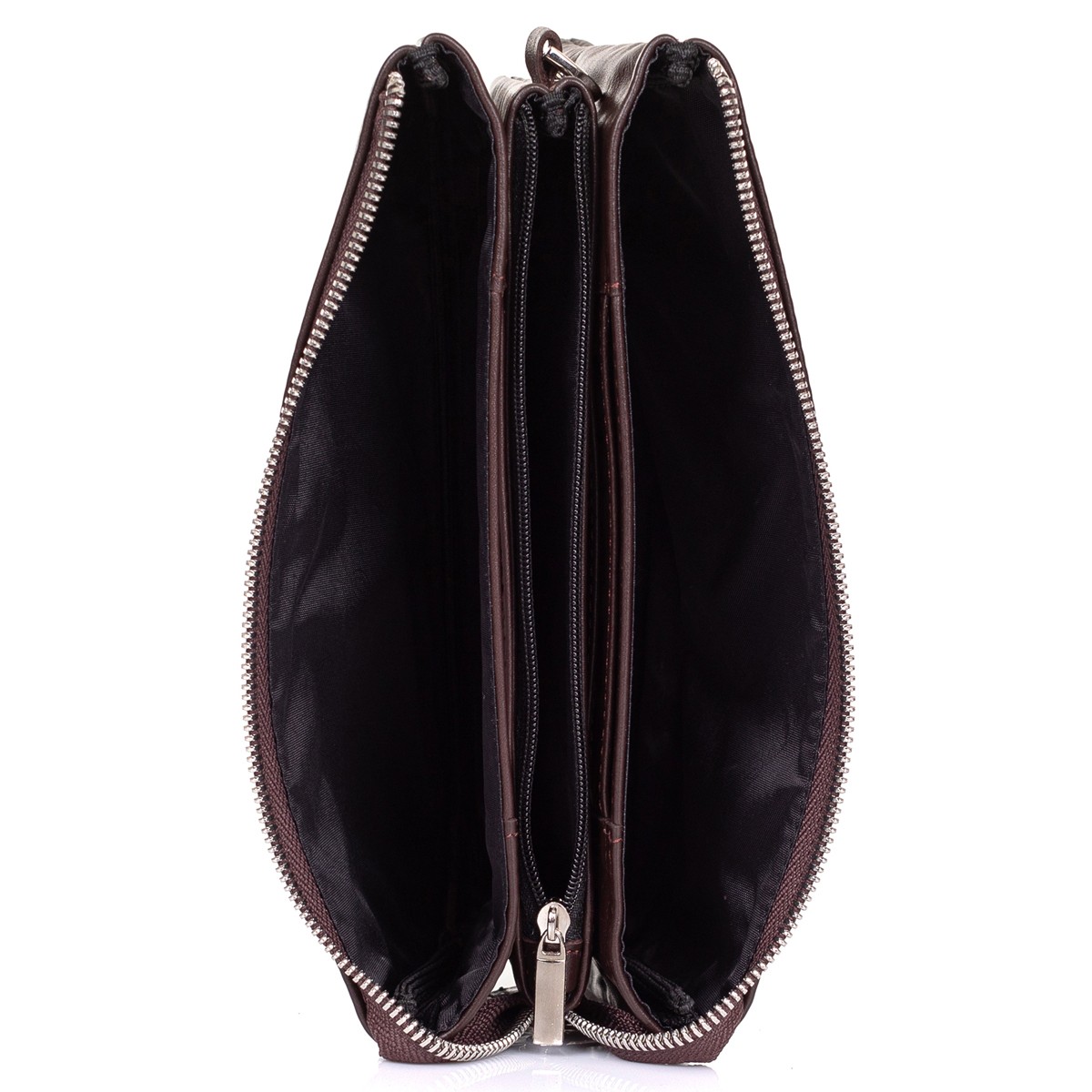 Изделие мягкой конструкции выворотное. Изготовлено прошивным методом. Состоит из трех отделений закрывающихся на две молнии. Внутри два плоских кармана и 6 карманов для карт (визиток). Изделие имеет съемную ручку-петлю на карабине.